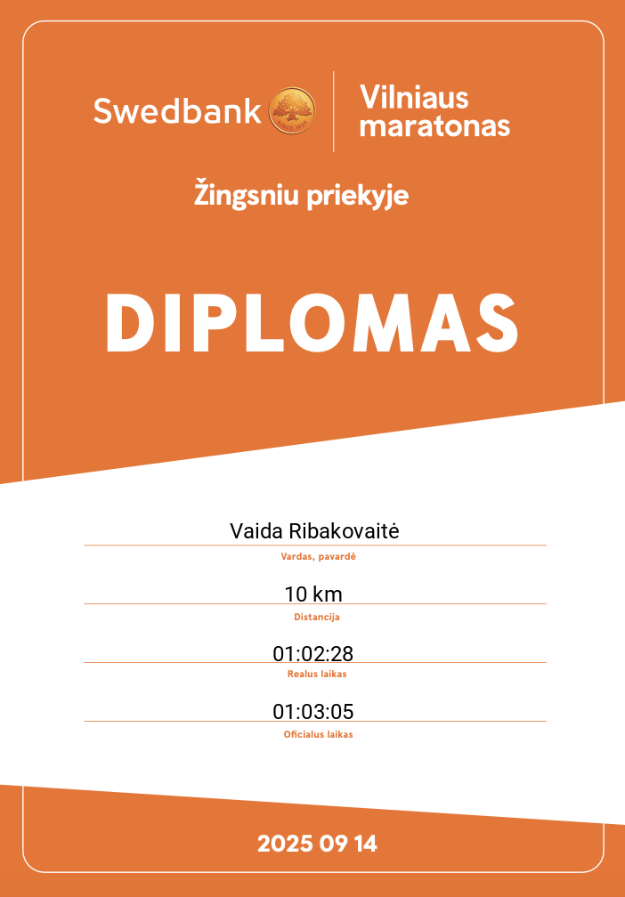| 1223 | Vaida Ribakovaitė | Jos Juda | 21271 | Lithuania | 10 km | 01:03:05 | Diplomas |