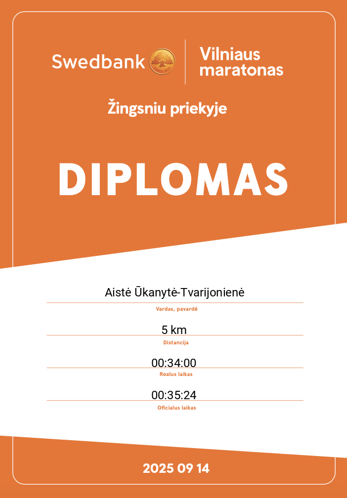 | 1590 | Aistė Ūkanytė-Tvarijonienė | VISADA CENTRINIS | 31938 | Lithuania | 5 km | 00:35:24 | Diplomas |