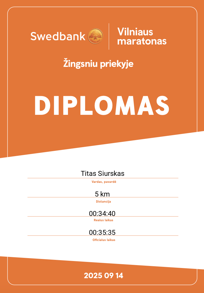 | 2174 | Titas Stasionis | 31527 | Lithuania | 5 km | 00:39:34 | Diplomas | |