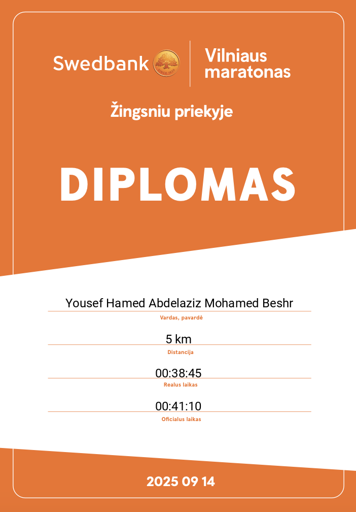 | 2323 | Yousef Hamed Abdelaziz Mohamed Beshr | Qdev Technologies | 32049 | Lithuania | 5 km | 00:41:10 | Diplomas |