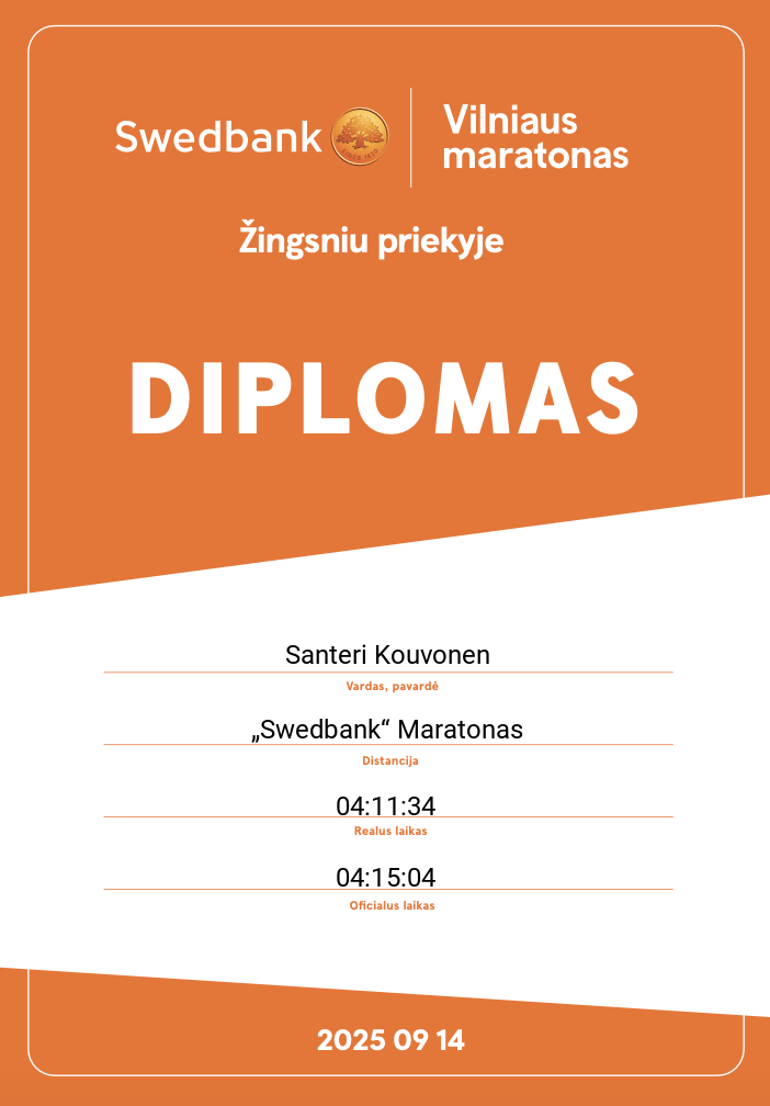 | 105 | Jaakko Suomalainen | Helsinki Running Crew | 663 | Finland | „Swedbank“ Maratonas | 03:12:57 | Diplomas |
