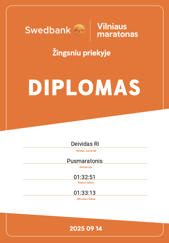 | 175 | Deividas Ri | 10310 | Lithuania | Pusmaratonis | 01:33:13 | Diplomas | |