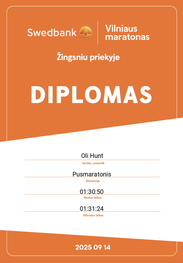 | 145 | Rolandas Vasiliauskas | Run | 1837 | Lithuania | „Swedbank“ Maratonas | 03:20:47 | Diplomas |