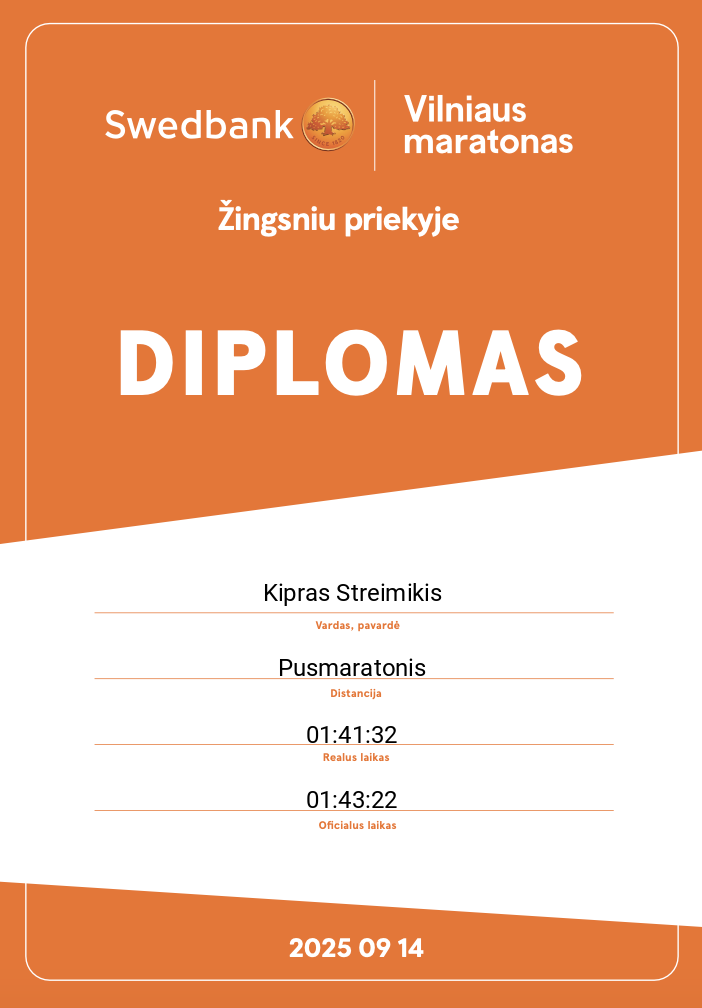 | 426 | Kipras Streimikis | 12884 | Lithuania | Pusmaratonis | 01:43:22 | Diplomas | |