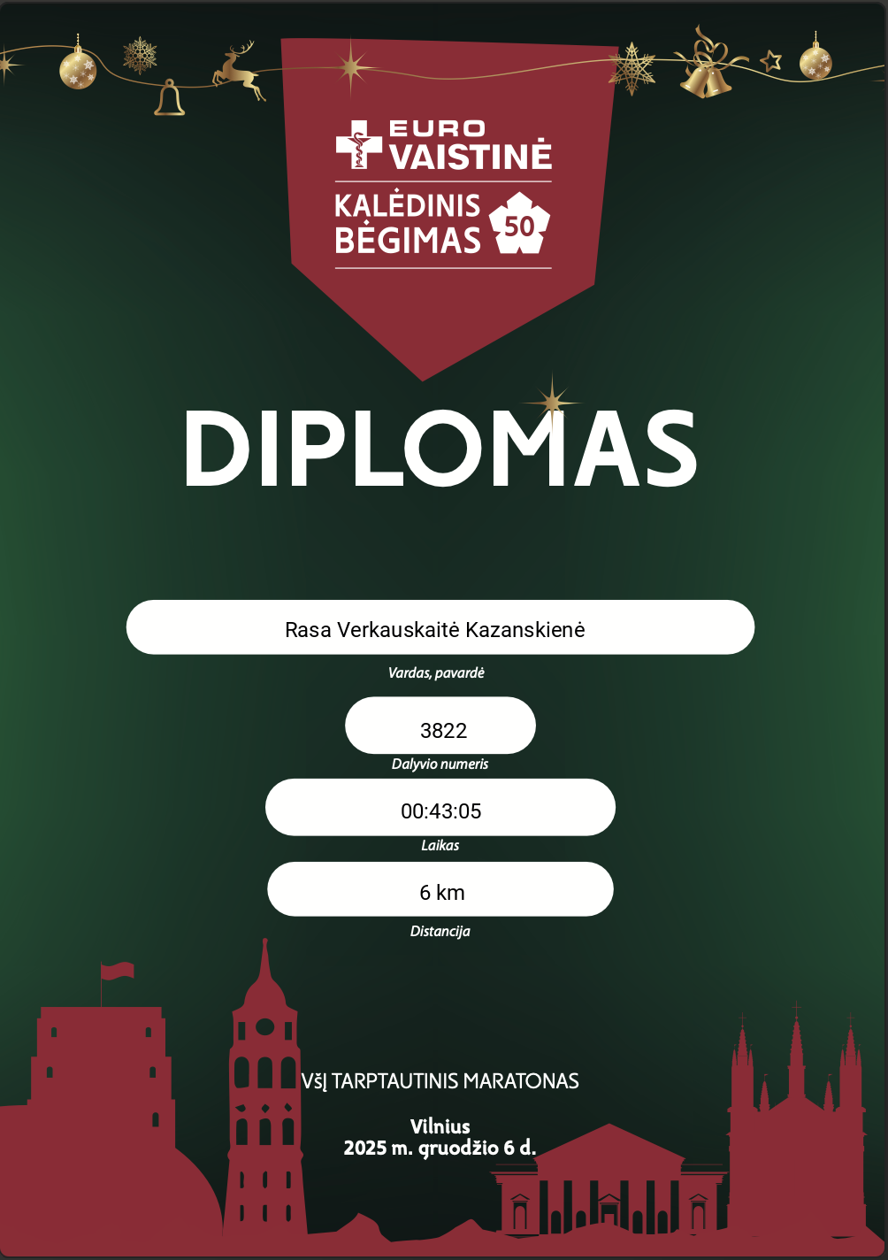 | 860 | Rasa Verkauskaitė Kazanskienė | 3822 | Lithuania | 6 km | 00:43:05 | Diplomas | |
