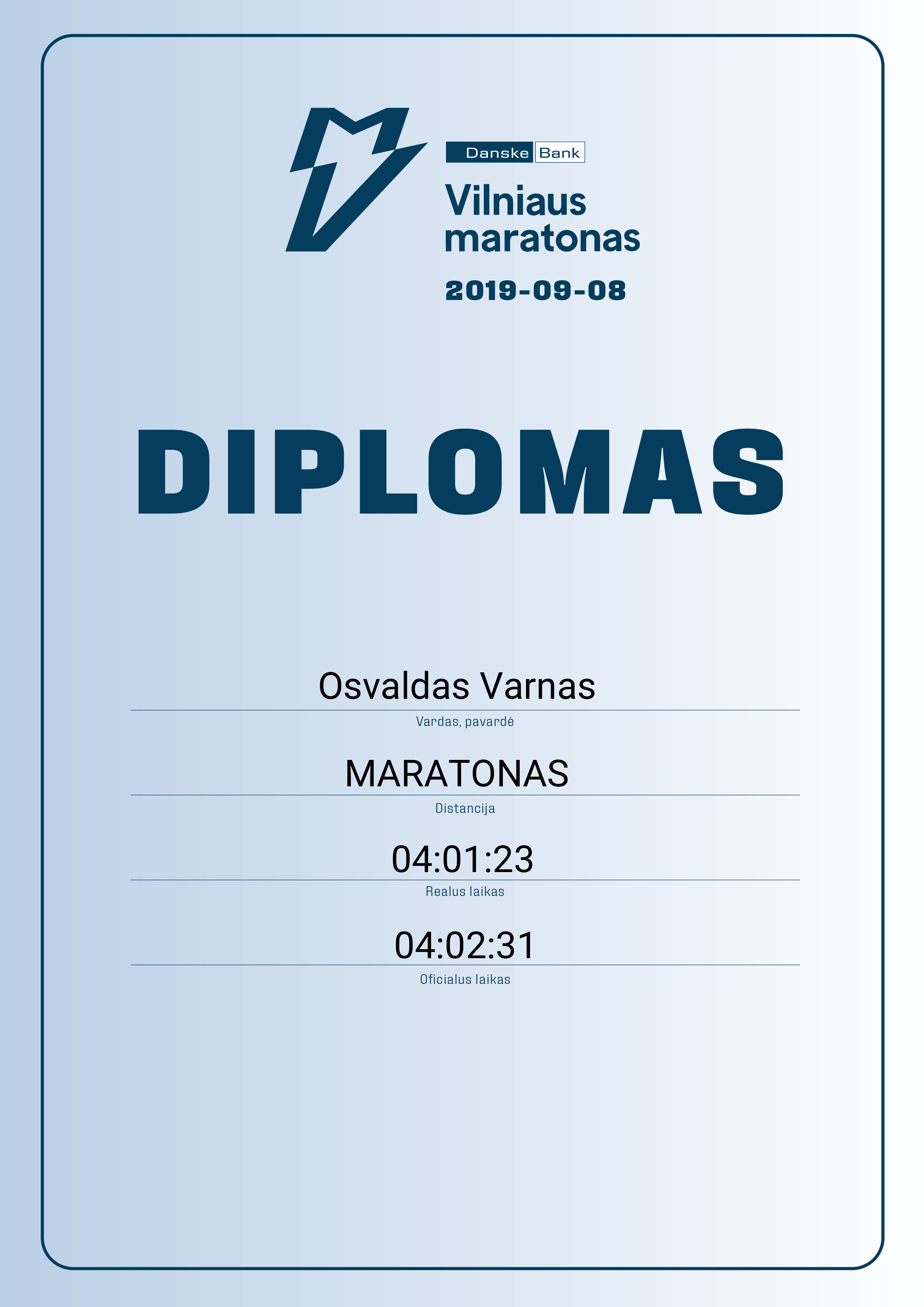 | 395 | Osvaldas Varnas | 290 | Lithuania | MARATONAS | 04:02:31 | Diplomas | |