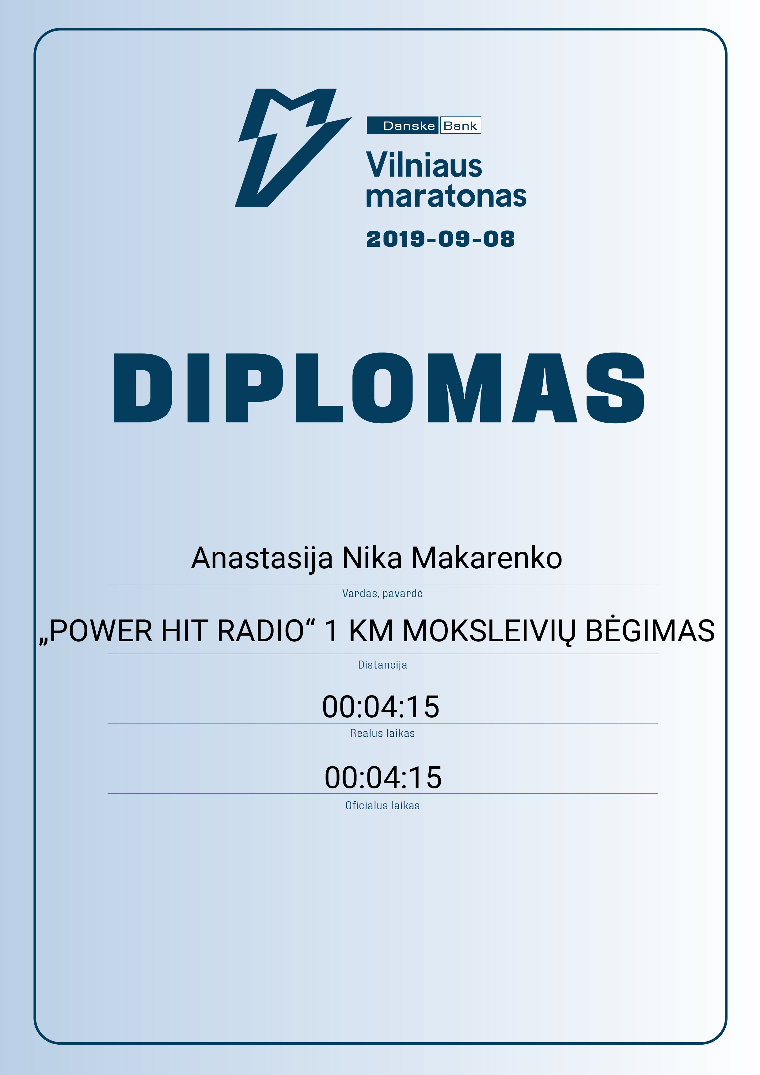 | 31 | Anastasija Nika Makarenko | begikės | 60026 | Macao | „POWER HIT RADIO“ 1 KM MOKSLEIVIŲ BĖGIMAS | 00:04:15 | Diplomas |